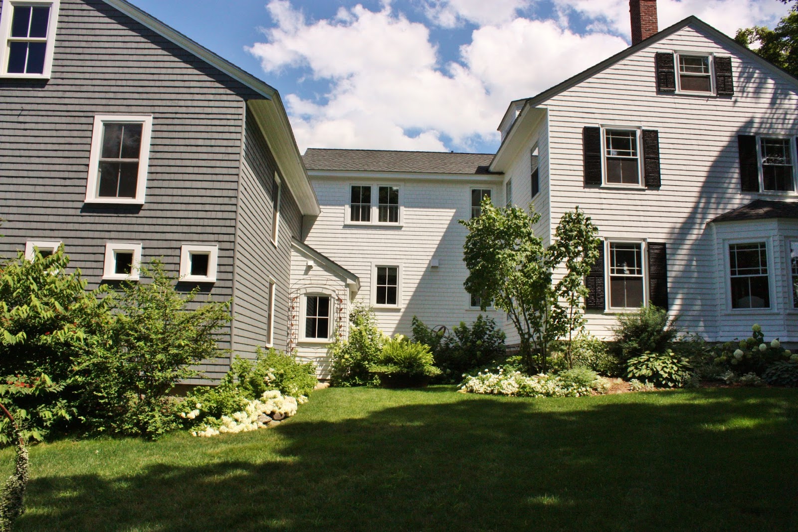 This is the courtyard after phase I (the farmhouse) and phase II (the barn) of the renovation. The first thing we did in the yard (after having all our antique maples looked at and trimmed by an arborist) was to install french drains around the entire house- you can see the gravel along the edge in this photo. One of those not fun expenditures, but one that after it's done and your basement doesn't leak anymore you are so glad you spent the money!