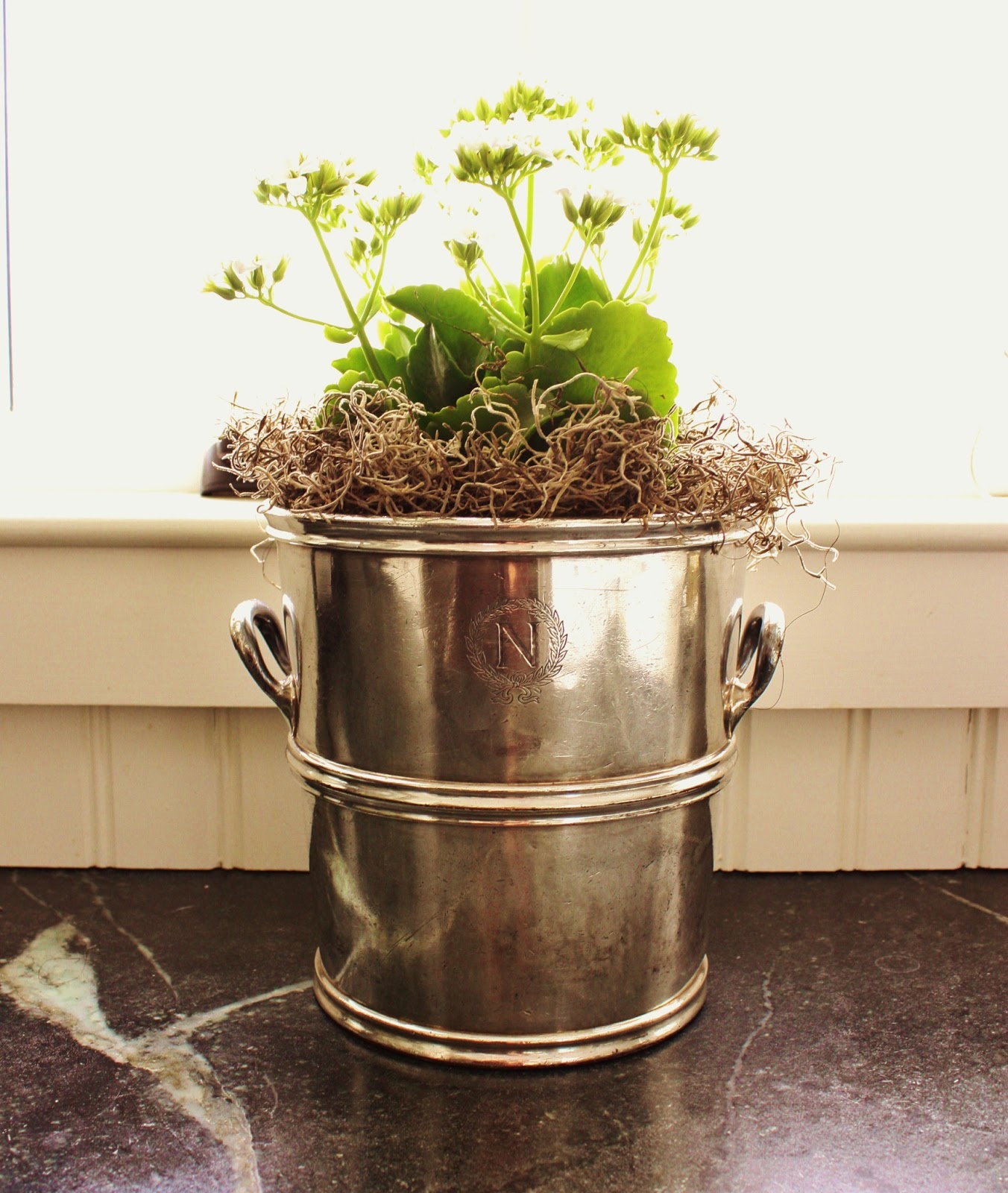 Vintage hotel-silver champagne buckets flank the sink and hold white Kalanchoes. This champagne bucket is from the Hotel Tuller in Detroit.